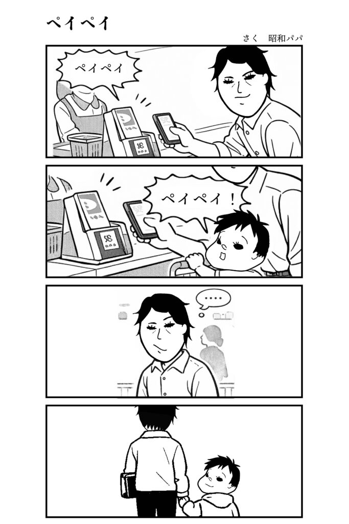 ペイペイ 育児記録 2026.01.242026.01.29 「ペイペイ」 「ペイペイ」 私のペイペイは、二回鳴る。 すっかりキャッシュレス派になり、 支払いの大半はペイペイだ。 スーパーでも、 コンビニでも、 気づけばいつも使っている。 どうやら、 息子も覚えてしまったらしい。 決済が終わると、 あの音が鳴る。 「ペイペイ」 それを合図に、 息子のペイペイが続く。 「ペイペイ」 少し遅れて、 二回目。 私は、 レジ前で、 ほんの少しだけ、 恥ずかしくなる。